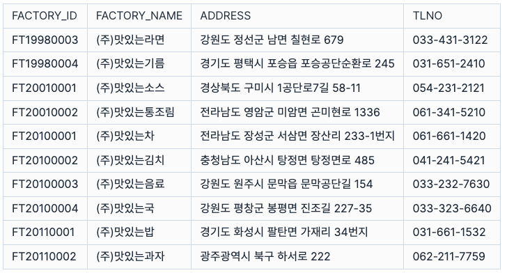 FOOD_FACTORY 테이블이 다음과 같을 때