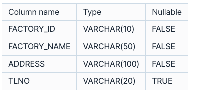 다음은 식품공장의 정보를 담은 FOOD_FACTORY 테이블입니다. FOOD_FACTORY 테이블은 다음과 같으며 FACTORY_ID, FACTORY_NAME, ADDRESS, TLNO는 각각 공장 ID, 공장 이름, 주소, 전화번호를 의미합니다.