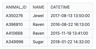 - 'Raven'이라는 이름을 가진 개와 고양이가 있으므로, 이 중에서는 보호를 나중에 시작한 개를 먼저 조회합니다.